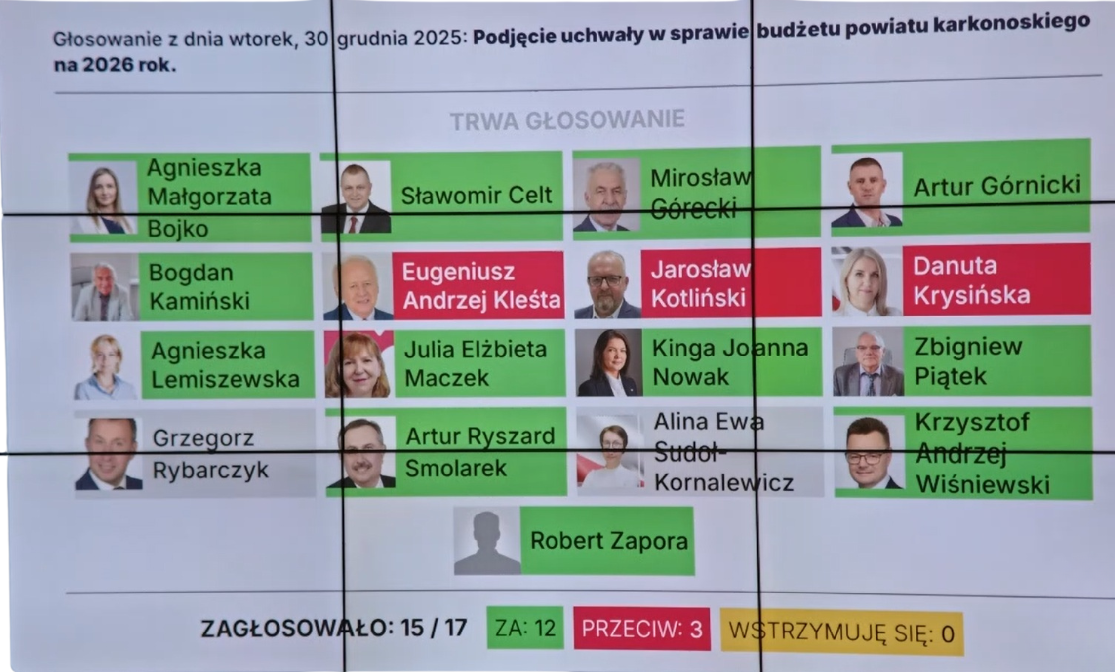 30 grudnia podczas XXV Sesji Rady Powiatu Karkonoskiego radni przyjęli budżet na nadchodzący rok. Za uchwałą głosowało 12 radnych, 3 było przeciw. W sesji uczestniczyło 15 z 17 radnych.