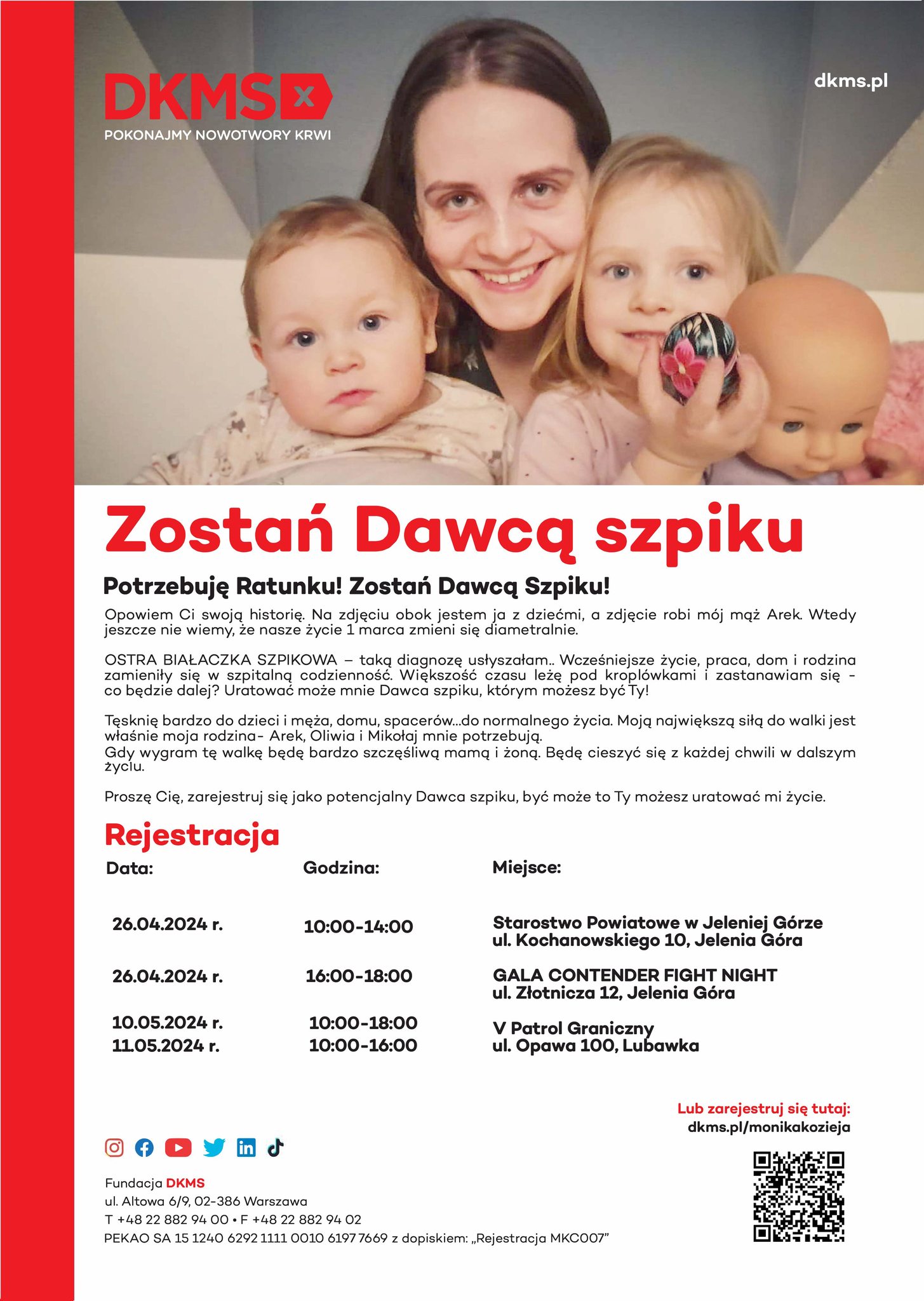 W Polsce co 40 minut, a na świecie co 27 sekund, ktoś dowiaduje się, że cierpi na białaczkę lub inny nowotwór krwi. Dla wielu chorych jedyną szansą na życie jest znalezienie zgodnego Dawcy komórek macierzystych. Każda zarejestrowana osoba jest niezwykle cenna. W bazie DKMS w Polsce znajduje się obecnie ponad 1,7 milionów zarejestrowanych Dawców, jednak wciąż potrzebni są nowi, ponieważ aż co piąty chory nie znajduje swojego Dawcy. Po przebadaniu wymazu i wprowadzeniu danych do bazy staniemy się aktywnymi potencjalnymi Dawcami. Od tego momentu Nasze zgłoszenie będzie brane pod uwagę przy każdym przeszukaniu naszej bazy dla Pacjentów potrzebujących przeszczepienia komórek macierzystych z całego świata.
